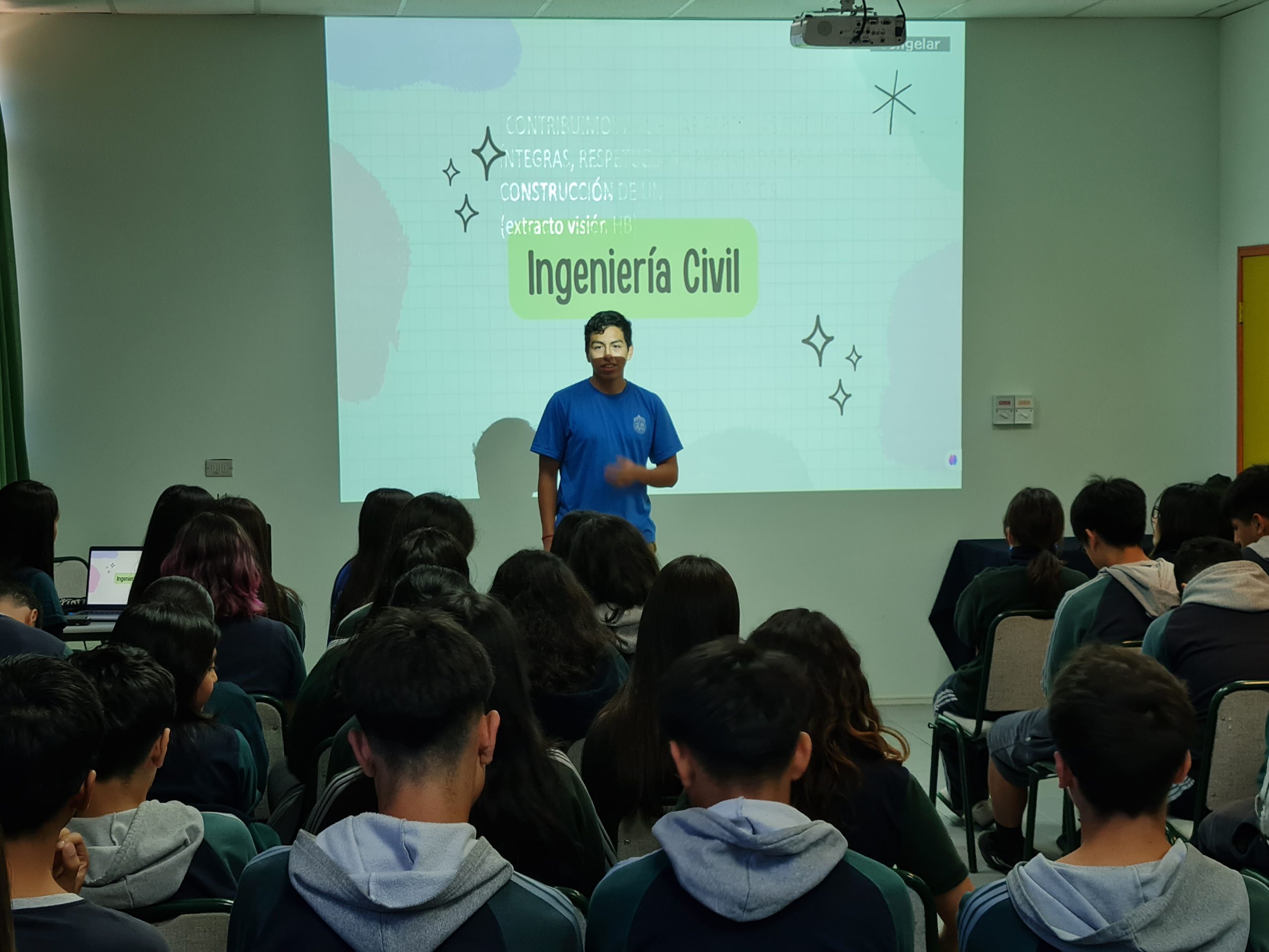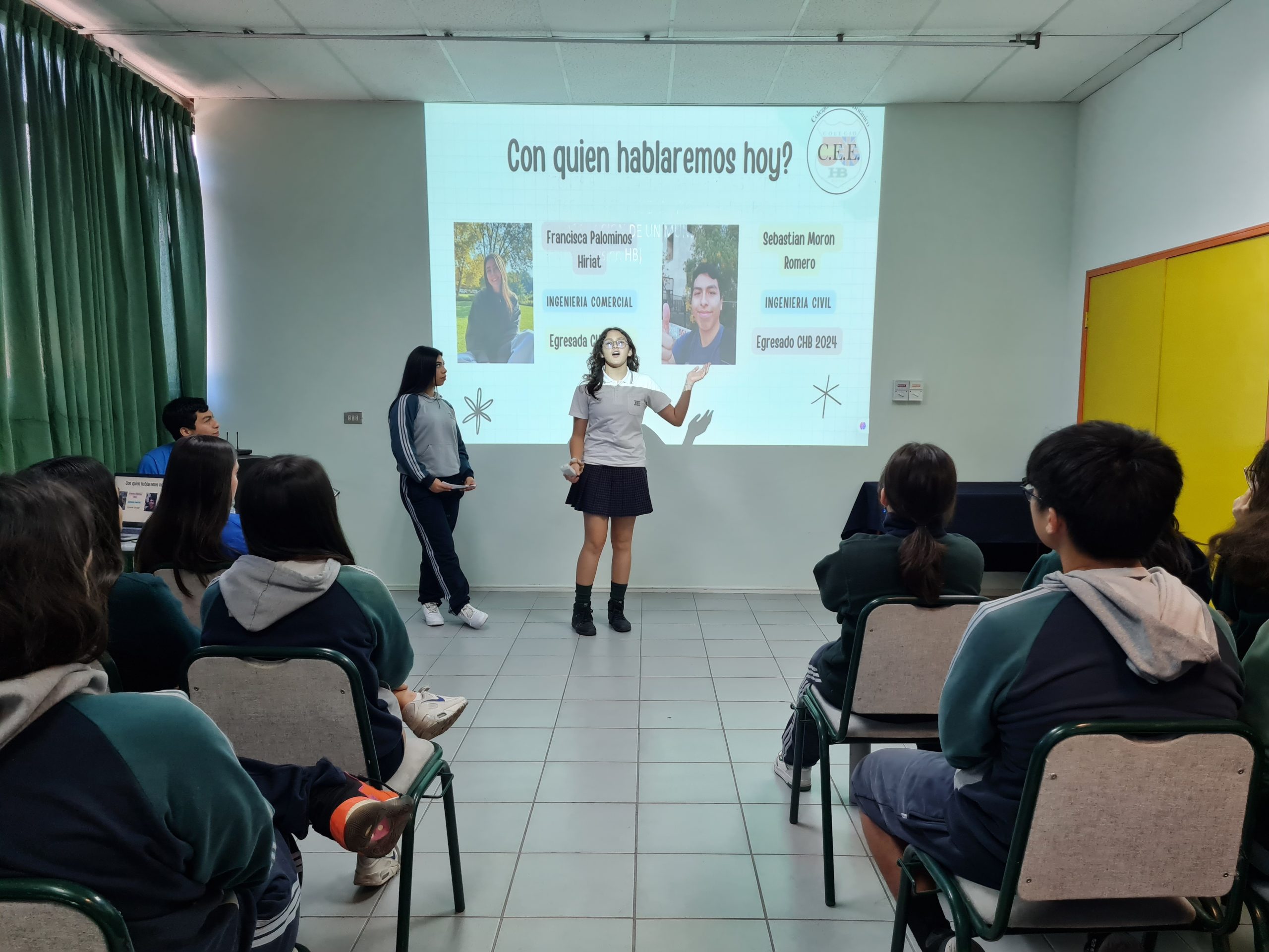 Este lunes 28 de abril, los estudiantes de IV Medio participaron en una enriquecedora charla organizada por el Centro de Estudiantes, donde dos destacados egresados de nuestro Colegio compartieron sus experiencias universitarias y el camino que los llevó a estudiar la carrera de sus sueños en una de las instituciones más prestigiosas del país.